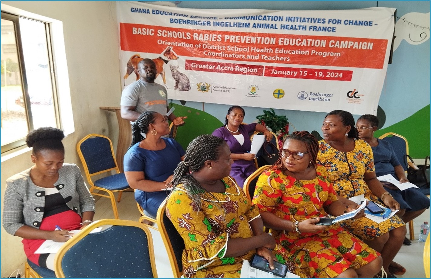 Led by field program operatives of CIC-Ghana, the basic schools’ rabies education campaign has so far trained a total of 291 District and School Health Education Coordinators, School Improvement Support Officers and Head teachers in 10 municipalities and districts of the Greater Accra Region in rabies prevention and effective treatment of dog bites. Communication and educational materials such as posters, rabies prevention and dog bites treatment guides and flip charts have been provided to the teachers to enable them integrate appropriate rabies prevention messages in their daily interactions with the school children.