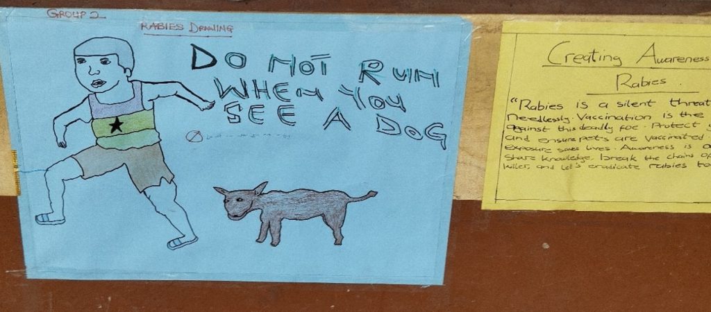 Supervision and Monitoring activities undertaken by CIC and GES/SHEP Officials of school level activities in the schools participating in the rabies prevention education campaign reveal that children have mastered the information about rabies prevention presented though the implementation of the individual school’s action plans. Some of the children have demonstrated their understanding of the messages through illustrations of the callas to action.
